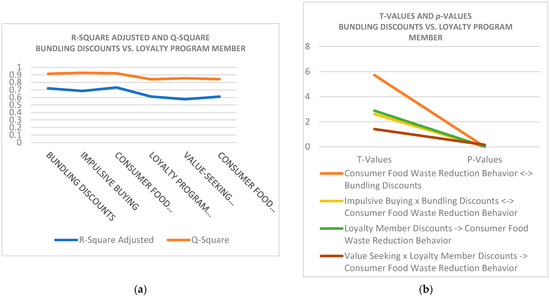 Based on Table 7, the structural model analysis reveals that bundling discounts, impulsive buying, and consumer food waste reduction behavior are significant with high effect strengths and have the following adjusted R2: 0.721, 0.685, and 0.733, respectively. The high Q2 values confirm the strong predictive relevance of the models, such as the above 0.9 for bundling discounts and the above 0.8 for loyalty program discounts. Food waste is significantly influenced by bundling discounts and impulsive buying, while loyalty program discounts and value-seeking behavior are strong in ensuring sustainable practices. Hypothesis testing showed all hypotheses to be significant, considering that the t-statistic is greater than 1.96 and the p-value is less than 0.05, thus providing meaningful insights into consumer behavior and eco-friendly practices.