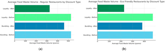 (a) Diagram of comparison of food waste volumes in regular restaurants with bundling and loyalty discount strategies. (b) Diagram of comparison of food waste volumes in eco-friendly restaurants with bundling and loyalty discount strategies.