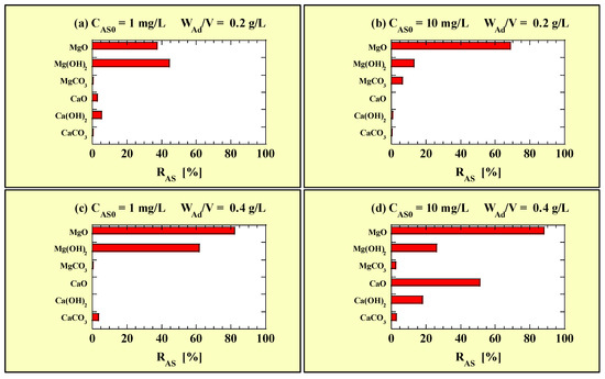 As shown in Figure 1, MgO and Mg(OH)2 exhibited As(III)-removal abilities, and their RAS values were higher when WAd/V was higher; however, MgCO3 minimally removed As(III) under the test conditions. The Ca-based adsorbents could not remove As(III) under most conditions, as shown in Figure 1a–c. However, when CAS0 = 10 mg/L and WAd/V = 0.4 g/L (Figure 1d), they exhibited a significant increase in RAS values, particularly when the RAS of CaO was >50%. The RAS of each adsorbent varied depending on the combination of CAS0 and WAd/V; however, MgO exhibited the highest As(III)-removal performance.
