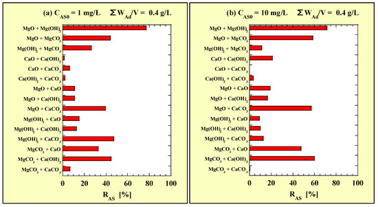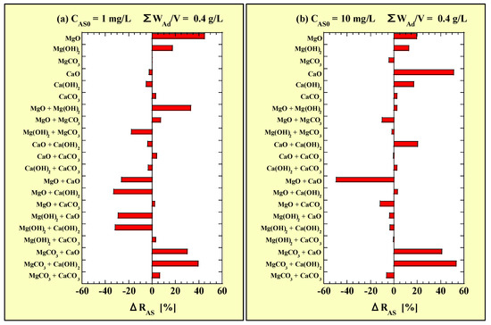 Figure 11 shows that the ΔRAS value significantly varied with adsorbent combination and CAS0. At CAS0 = 1 mg/L, the ΔRAS values for the MgO single addition and MgO + Mg(OH)2, MgCO3 + CaO, and MgCO3 + Ca(OH)2 combined additions were positive. However, the ΔRAS value for the combined addition of MgO or Mg(OH)2 with CaO or Ca(OH)2 was negative. At CAS0 = 10 mg/L, the ΔRAS values for the CaO single addition and MgCO3 + CaO, and MgCO3 + Ca(OH)2 combined additions were positive. Moreover, the ΔRAS value for the combined addition of MgO with CaO was negative. Therefore, from the viewpoint of ΔRAS, when ΣWAd/V increased from 0.2 to 0.4 g/L, the MgO single addition at CAS0 = 1 mg/L and CaO single addition at CAS0 = 10 mg/L exhibited the most improved As(III)-removal performances. However, both MgCO3 + CaO and MgCO3 + Ca(OH)2 had extremely high ΔRAS values at both CAS0 = 1 and 10 g/L, indicating that combined addition had an extremely high synergistic effect on the removal performance of As(III). This result was similar to that for As(V) reported in a previous study [22].