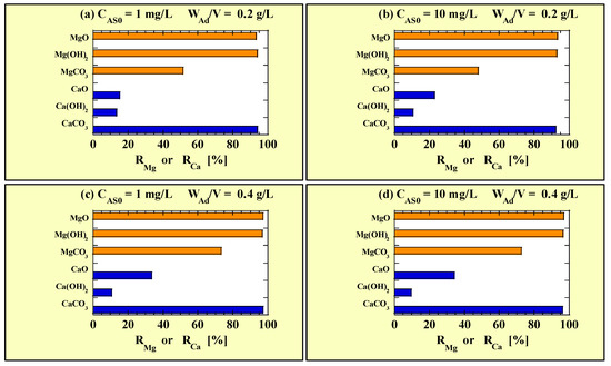 RMg and RCa for the combined-addition tests at (a) CAS0 = 1 mg/L with WAd/V = 0.2 g/L; (b) CAS0 = 10 mg/L with WAd/V = 0.2 g/L; (c) CAS0 = 1 mg/L with WAd/V = 0.4 g/L; (d) CAS0 = 10 mg/L with WAd/V = 0.4 g/L. ■ RMg; ■ RCa.