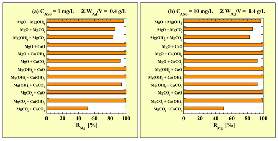The values of CMg and CCa for the combined-addition tests are presented in Table 8 and Table 9, respectively. Figure 4 shows the RMg values calculated using data in Table 8 for the combined-addition tests. Figure 4a and Figure 4b show the RMg values for CAS0 = 1 and 10 mg/L with ΣWAd/V = 0.4 g/L, respectively.