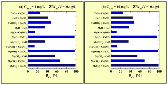 Figure 5 shows the RCa values calculated using the data in Table 9 for the combined-addition As(III)-removal tests. Figure 5a and Figure 5b show the RCa values for CAS0 = 1 and 10 mg/L with ΣWAd/V = 0.4 g/L, respectively.