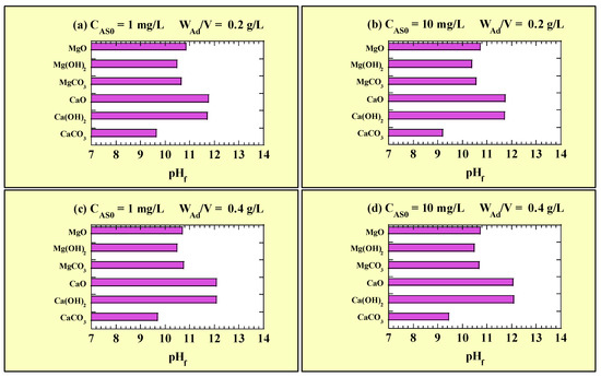 Figure 6 shows the pHf values for the single-addition As(III)-removal tests. Figure 6a and Figure 6b show the pHf values for CAS0 = 1 and 10 mg/L with WAd/V = 0.2 g/L, respectively. Figure 6c and Figure 6d show the pHf values for CAS0 = 1 and 10 mg/L with WAd/V = 0.4 g/L, respectively. The measured pH0 values for the single-addition tests at CAS0 = 1 and 10 mg/L were 7.27–7.41 and 6.80–7.38, respectively. Regardless of the adsorbent added, the pH shifted towards alkalinity. The pHf values under the test conditions were in the following order: CaCO3 < Mg(OH)2 < MgO, MgCO3 < CaO, Ca(OH)2. No clear effect of CAS0 on pHf was observed for any of the adsorbents. Additionally, for the Mg-based adsorbents and CaCO3, no clear effect on pHf was observed when WAd/V increased from 0.2 to 0.4 g/L. However, for CaO and Ca(OH)2, the pHf increased with increasing WAd/V.