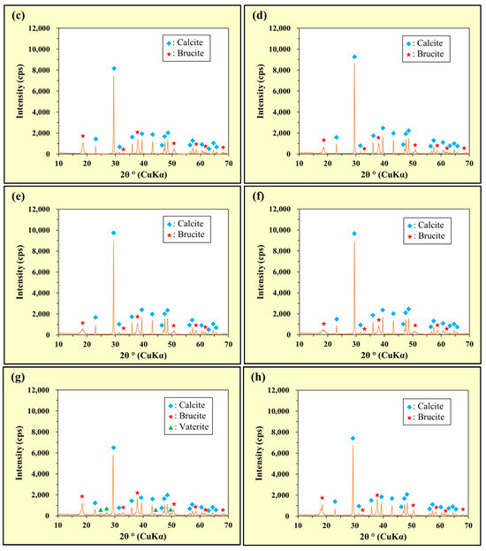 The As(III) solutions used for samples (e) and (f) were prepared as described in Section 2.2.1. The As(V) solution used for samples (g) and (h) was prepared by dissolving the Na2HAsO4·7H2O powder reagent in deionized water and adjusting the solution pH with aqueous HNO3 and NaOH. To prepare samples (c)–(h), 250 mL of the prepared solution (deionized water, As(III) solution, or As(V) solution) was placed into four different TPX beakers. Subsequently, 0.1 g of MgCO3 and 0.1 g of CaO or Ca(OH)2 were added to each beaker, followed by immediate stirring using a magnetic stirrer for 24 h. The samples were then subjected to solid–liquid separation via suction filtration (filter pore size: 0.45 μm). The collected solutions were combined into single containers, and the concentrations of As, Mg, and Ca in the collected solutions of (e)–(h) were determined using ICP-MS and ICP-AES. The collected solid samples were dried overnight at 40 °C, and the crystalline phases of the prepared samples were identified using powder XRD (RINT-2500, Rigaku Co., Akishima, Japan) at the GSJ-Lab (AIST).