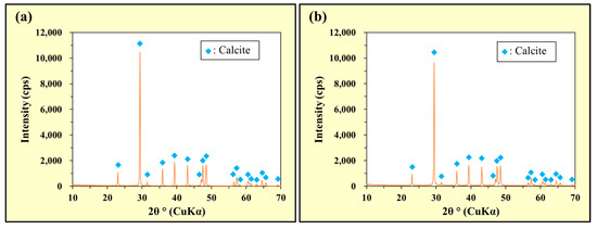 In both Figure 10a,b, strong peaks indicating the generation of CaCO3 (calcite) were observed. These results confirmed that the Ca2+ released by the dissolution of Ca(NO3)2 combined with CO32− released by the dissolution of Na2CO3 to generate CaCO3 in the alkaline solutions.