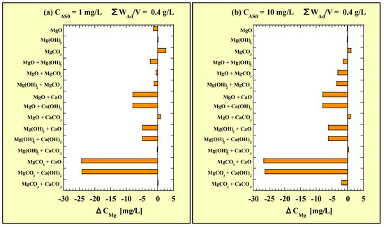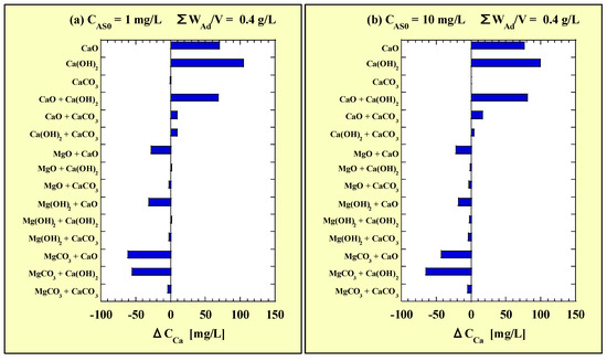 Each ΔCMg value of the combined additions is shown in Figure 12. Figure 12a and Figure 12b correspond to CAS0 = 1 and 10 mg/L, respectively. Similarly to the ΔCMg value, each ΔCCa value of the combined additions is shown in Figure 13. Figure 13a and Figure 13b correspond to CAS0 = 1 and 10 mg/L, respectively.
