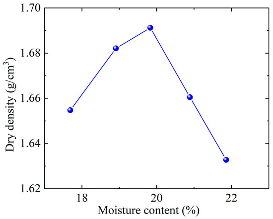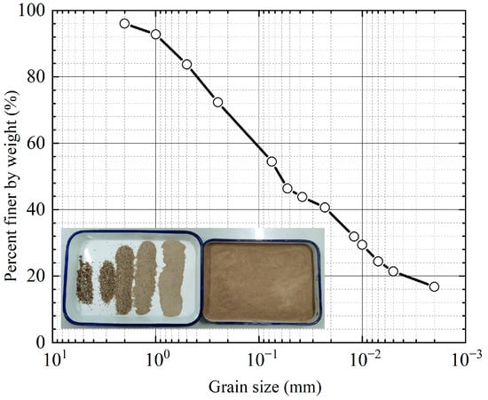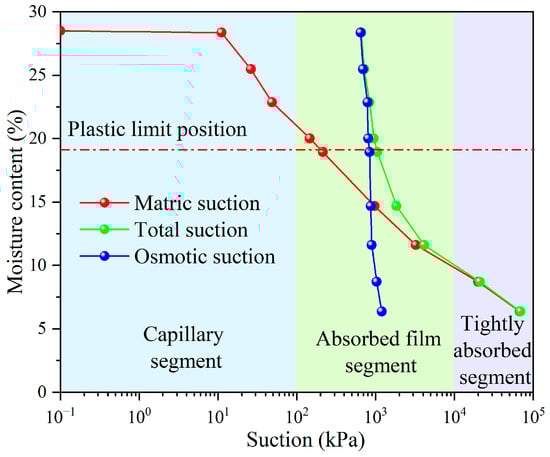 The expansive soil used in the experiments was sourced from the Yanji section of the Jilin–Tumen–Hunchun high-speed railway, a location representative of the region (Figure 1). The topography is mainly intermountain erosion hilly landform, and the groundwater is rich and mainly fissure water. The strata are mainly interbedded sandstone and mudstone of the upper Cretaceous Longjing Formation. The surface Quaternary Holocene residual slope silty clay is hard-plastic. The upper Cretaceous Longjing Formation sandstone and mudstone are interbedded. The rock is soft and the argillaceous cementation is poor. In its natural state, the soil is characterized by a hard-plastic state, with a natural moisture content of 19.17% and a dry density of 1.49 g/cm3 (Figure 2). After air drying and grinding, using a 2 mm sieve, the large particles were removed from the expansive soil collected from the site. The basic physical properties of the soil are outlined in Table 1, with the grain size distribution shown in Figure 3, the compaction curve shown in Figure 4, and the proportions of each fraction presented in Table 2. The characteristic curve of soil and water was determined by the filter paper method, and the moisture content–suction relationship of expansive soil is shown in Figure 5. The free expansion rate test revealed that the soil’s free swelling rate is 50%. According to the Code for Soil Test of Railway Engineering (TB 10102-2023; China’s Ministry of Transport, 2023), this soil is classified as weak expansive soil and categorized as sandy fine-grained soil, a type of low liquid limit clay (CL-S).