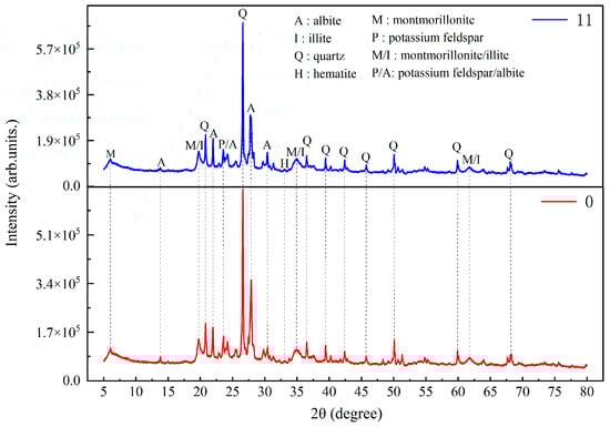 The composition and structural morphology of the clay minerals was obtained via X-ray diffraction analysis (Figure 7). Based on the XRD analysis of the unsaturated expansive soil, the impact of these cycles on the material composition of the expansive soil from Yanji was investigated. The characteristic peaks of montmorillonite with a center of 6.03° (2θ) appear in the XRD patterns, and the diffraction peaks of the montmorillonite phase in the system decrease under the FTCs. The characteristic peaks of the albite phase appear between 26° and 30° (2θ). By comparing the characteristic peaks of albite after 0 and 11 FTCs, the diffraction intensity decreases. As the NFTC increases, the diffraction peak intensity of quartz strengthens. The XRD analysis results indicate that the tested expansive soil from Yanji is mainly composed of montmorillonite, albite, quartz, potassium feldspar, illite, and hematite. After 11 FTCs, the XRD diffraction peak was shifted to the left at a small angle due to the increase in the lattice constant, which may be due to the change in the lattice constant caused by the doping of atoms. This can also be caused by lattice distortion. The contents of the various substances in the samples subjected to 0 and 11 FTCs are presented in Table 4. With increasing NFTC, the contents of quartz, illite, and hematite increase, while the contents of montmorillonite, albite, and potassium feldspar decrease. The FTC exerts a form of frozen differentiation effect, which is more intense than the common physical differentiation effect and has a greater effect on the soil structure.