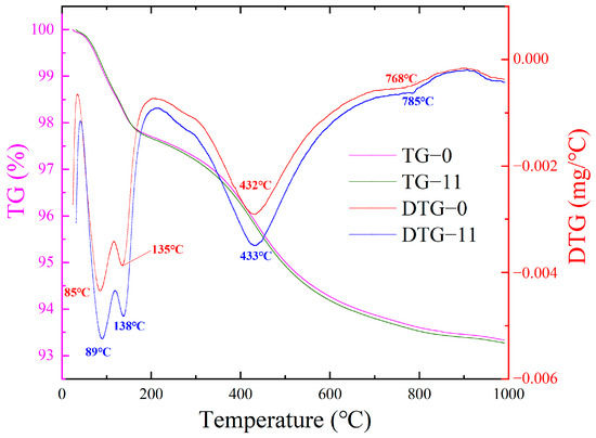 TG–DTG curves of the expansive soil after different NFTC. Note: TG−0 and TG−11, DTG−0 and DTG−11 represent the TG curves and DTG curves of Yanji expansive soil samples with 0 and 11 FTCs, respectively.