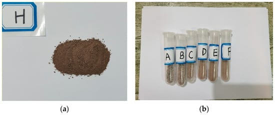 Particle separation results for the expansive soil: (a) Unclassified expansive soil; and (b) Expansive soil stored in tubes after separation. Note: Group A, B, C, D, E, F, and H represent different groups of expansive soil particles.