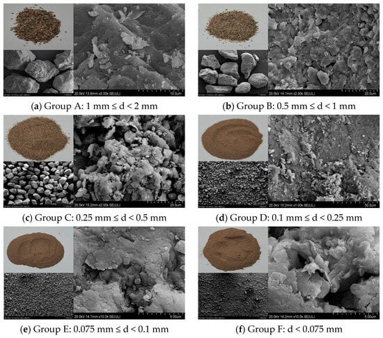 For the soil sample utilized in this study, the silt content is 33.05% and sand content is 41.58%. These two components collectively form the skeletal structure of the expansive soil. The clay cements and encapsulates the single grains. The mineral composition is intricately linked to the particle size. Consequently, both the shape and structure of the soil particles vary according to their sizes. To further investigate the properties of the expansive soil particles, we conducted segmented analysis on the samples collected from Yanji according to the different particle size ranges. To ensure complete dispersion of these interbonded particles, wet sieve analysis was employed to separate them into distinct particle size fractions. The results of the expansive soil particle separation are shown in Figure 9, where Group A consists of soil particles above 1mm-sieve; Group B consists of soil particles above 0.5mm-sieve; Group C consists of soil particles above 0.25mm-sieve; Group D consists of soil particles above 0.1mm-sieve; Group E consists of soil particles above 0.075mm-sieve; Group F consists of soil particles under 0.075mm-sieve; and Group H is unclassified expansive soil particles.