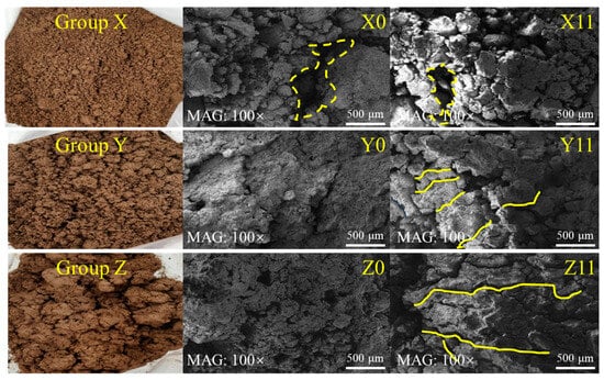 Expansive soils exhibit varying characteristics depending on the moisture content. When the natural moisture content approaches the plastic limit, the expansive soil is in a dry state and becomes hard and prone to cracking. Conversely, when this type of soil is saturated, its volume increases significantly with increasing moisture content, demonstrating pronounced expansibility. The cracks may narrow or close as the soil structure becomes denser. As the moisture content decreases, the volume of the soil inevitably shrinks, leading to shrinkage phenomena and contraction stress. In this study, for the remolded expansive soil sample, the soils with different moisture contents also exhibited distinct characteristics (Figure 12). The microstructure of the low-moisture-content samples revealed that the clay particles initially aggregated around the sand or silt particles while still maintaining a flocculent structure. During the sample preparation, particle formation occurred due to compaction efforts. With increasing moisture content, the clay particles continued to aggregate. However, the Group Y samples achieved the most dense state. Additionally, more fragmentation cracks developed after the FTCs. In the Group X samples (i.e., a lower moisture content), the contacts between the particles remained relatively sparse. Consequently, numerous large pores persisted after compaction. In contrast, for the Group Z samples, after compaction, a more pronounced agglomeration phenomenon was observed in the dry soil mixed with water. This resulted in an increase in the presence of large pores and enhanced penetration pore development under FTC conditions.