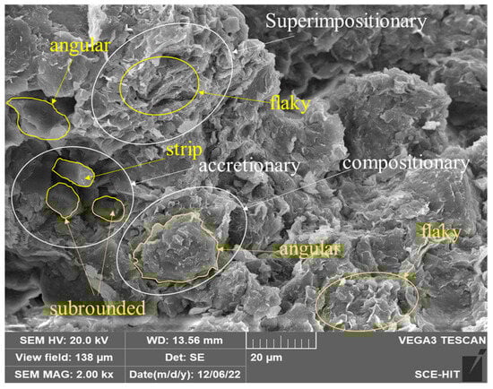 The morphologies of the soil particles of the expansive soil were observed under 2000× magnification (Figure 13), including granular and agglomerate types. The granular particles can be subdivided into subrounded, angular, strips, flaky, and mostly angular and flaky. The particle agglomerates can be subdivided into compositionary, accretionary and superimpositionary, and mainly compositionary and superimpositionary. The compositionary particle agglomerates were formed by the complete cementation of the small particles to the large particles, which belong to the outer clay-like particles. The accretionary particle agglomerates were formed by the accumulation of particles. Due to the large clay content of the expansive soil, the accumulation form is relatively small, and the accumulation is a weak zone. The superimpositionary particle agglomerates were formed in the form of edge–edge, edge–face, or face–face contacts with the flake particles. Overall, the structural unit of the expansive soil sample is largely composed of compositionary and superimpositionary particle agglomerates, and a clay particle matrix is present in these structures, thus forming irregular aggregates. Following Ye et al. [31], loess contains a relatively high percentage of silt and exhibits weaker cementation. In contrast, this study finds that the particles in expansive soil have a higher clay content and stronger cementation, resulting in a more closely connected arrangement and a more robust structure. Moreover, the lower the moisture content, the more pronounced this characteristic becomes. This observation also explains why expansive soil was historically misidentified as a high-quality foundation material due to its high strength and low compressibility under drought conditions.