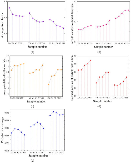 Microscopic characteristics of the expansive soil samples: (a) Average form factor; (b) Area–circumference fractal dimension; (c) Area probability distribution index; (d) Fractal dimension of particle distribution; and (e) Probabilistic entropy.