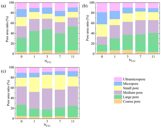 For the moisture content of 14% (Figure 15a), the influence of the FTCs on the different pore types was dynamic and persistent, and the proportion of each pore type fluctuated to a certain extent under different NFTC. In particular, the proportions of the coarse pores and ultramicropores changed greatly, while the proportion of the fine pores increased significantly after the first FTC and then gradually stabilized. The proportion of the large pores exhibited an increasing trend in general. For the moisture content of 20% (Figure 15b), the coarse pores fluctuated significantly during the FTCs, initially increasing and then decreasing. The large pores increased continuously. The medium pores fluctuated greatly during the FTCs. The small pores also fluctuated greatly during the FTCs, but they tended to decrease in general. In general, the number of fine pores increased gradually during the FTCs. The micropores and ultramicropores tended to decrease in general. For the moisture content of 26% (Figure 15c), the proportions of the coarse pores and ultramicropores decreased after multiple FTCs. The proportion of the pores of each category of fine pores fluctuated, and that of the large pores initially decreased and then increased. Generally speaking, the percentages of small and medium pores rose in the early stages and marginally declined in the later stages. There was a general upward trend in the percentage of micropores, which decreased in the early stages and rebounded in the latter stages.
