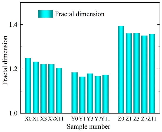 To visualize the changes in the characteristics of the different types of pore distributions after FTCs, the PCAS V2.3 software was used to calculate the classified pore characteristics. According to Table 3, the pores can be divided into coarse pores (d > 75 μm), large pores (20 μm < d ≤ 75 μm), medium pores (10 μm < d ≤ 20 μm), small pores (5 μm < d ≤ 10 μm), micropores (0.1 μm < d ≤ 5 μm), and ultramicropores (d ≤ 0.1 μm). A stacked bar plot of the pore classification area ratio changes is shown in Figure 15, and the changes in the fractal dimension are shown in Figure 16.