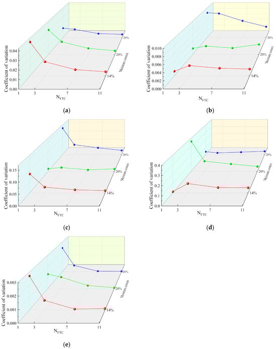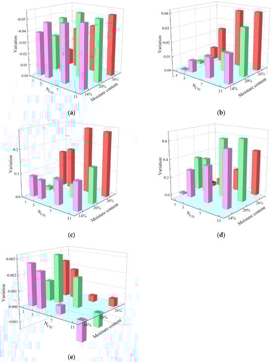 Figure 14a shows the variations in the average form factor, which decreases as the moisture content and NFTC increase. The greater the moisture content, the greater the effect of the NFTC. Under the action of FTCs, the particle edge shape tends to be complicated, and the collected grain shape tends to be irregular. Figure 14b shows the variations in the area–circumference fractal dimension o. As the moisture content and NFTC increase, the area–circumference fractal dimension of the particles increases until it becomes stable. It can be seen that the complexity of the morphology of the skeleton particles increases as the NFTC increases. Figure 14c shows the variations in the area probability distribution index with the NFTC, and it increases as the NFTC and moisture content increase. This indicates that the structural units with large areas decrease under the action of FTCs. With increasing moisture content, the adhesive effect of the clay particles is enhanced, and the structural units with large areas increase. Figure 14d shows the fractal dimension of the particle distribution. As the NFTC increases, the fractal dimension of the particle distribution increases. With increasing moisture content, the fractal dimension of the particle distribution gradually decreases. Under the strong physical weathering caused by FTCs, large particles are broken due to the effect of the freezing of the water in the soil, and the homogenization and concentration of the particles are enhanced. Figure 14e shows the probabilistic entropy, which initially increases and then decreases as the NFTC increases. It also increases with increasing moisture content. After the FTCs, it is evident that the particle arrangement changes from chaotic to ordered, with three FTCs marking a turning point. It is challenging for the particle distribution to achieve a uniform state during the compaction process because the bonding effect between the particles is increased by the increase in moisture content.