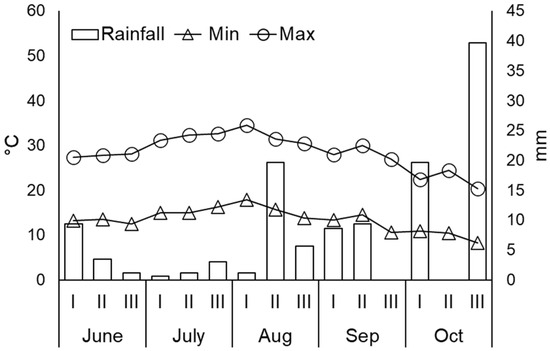 Air temperatures (minimum and maximum) and rainfall on a ten-day basis during the experimental period, where I, II, and III indicate the first, second, and third ten-day periods in each month.