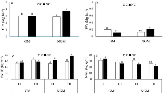 Significant interactions GM × A for total cured leaves and wrapper yield (CLY and WY, respectively; (a) and (b)) and GM × I × A for irrigation water use efficiency and nitrogen agronomic efficiency (IWUE and NAE, respectively; (c) and (d)). Different letters indicate least significant differences in the interactions at p < 0.05 and p < 0.01 (capital letters). GM (vetch green manuring), NGM (no vetch green manuring), FI (full irrigation, 100% ETc), DI (deficit irrigation, 70% ETc), C (compost amendment), NC (no compost amendment).