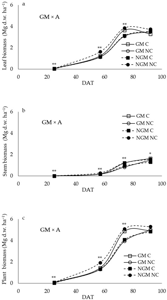Stem, leaf, and plant biomasses were significantly reduced under the DI regime, starting from 74 (stem) to 92 (stem, leaves and plant) DAT (Table 4). There was a significant interaction GM × A for all parameters from the beginning of growth (25 DAT) up to 74 (leaves and plant) and 92 (stem) DAT (Table 4; Figure 3): overall, the effect of OFMSW compost was positive only under GM conditions, whereas the contrary was recorded under NGM conditions when both the leaf and plant biomasses of NC were greater than those of C (Figure 3a,c).