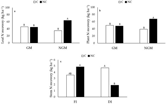 Significant interactions of GM × A (a,b) and I × A (c) for N recovery in leaf (a), plant (b), and stem (c), respectively, at 57 DAT. Different letters indicate least significant differences at p < 0.01. GM (vetch green manuring), NGM (no vetch green manuring), FI (full irrigation, 100% ETc), DI (deficit irrigation, 70% ETc), C (compost amendment), NC (no compost amendment), DAT (days after transplanting).