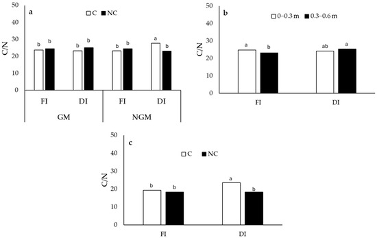 Significant interactions GM × I × A (a) and I × D (b) for C/N at 74 DAT and I × A (c) for C/N at 116 DAT. Different letters indicate least significant differences at p < 0.05 and p < 0.01 (capital letters). GM (vetch green manuring), NGM (no vetch green manuring), FI (full irrigation, 100% ETc), DI (deficit irrigation, 70% ETc), C (compost amendment), NC (no compost amendment), D (soil depth, 0–0.3 m and 0.3–0.6 m), DAT (days after transplanting).