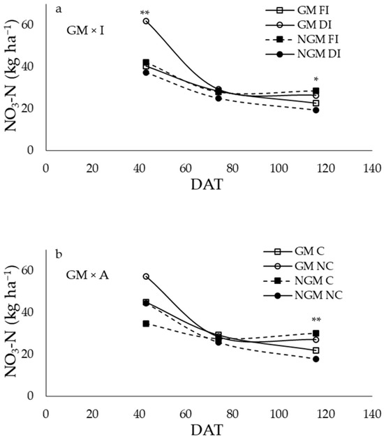 The effect of FI and DI (a), and C and NC (b) under GM and NGM conditions on soil nitrate N content (NO3-N, kg ha−1) during cropping. *, significant at p < 0.05; **, significant at p < 0.01. GM (vetch green manuring), NGM (no vetch green manuring), FI (full irrigation, 100% ETc), DI (deficit irrigation, 70% ETc), C (compost amendment), NC (no compost amendment), DAT (days after transplanting).