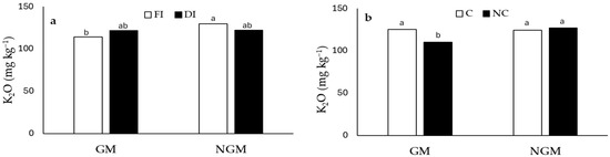 Significant interactions GM × I (a) and GM × A (b) for K2O at 116 DAT. Different letters indicate least significant differences at p < 0.05. GM (vetch green manuring), NGM (no vetch green manuring), FI (full irrigation, 100% ETc), DI (deficit irrigation, 70% ETc), C (compost amendment), NC (no compost amendment), DAT (days after transplanting).
