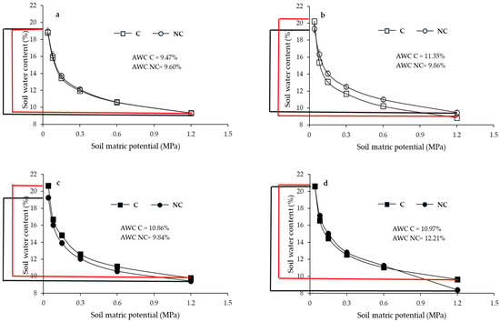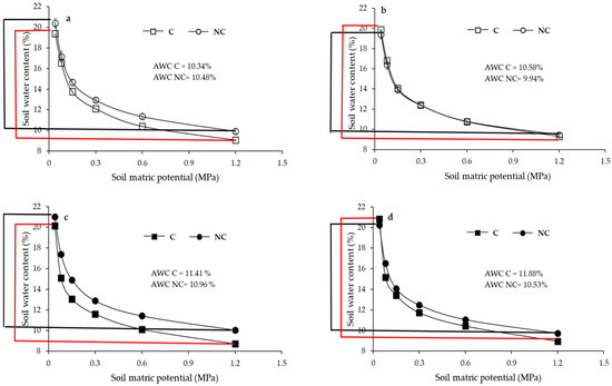 Soil water retention curves under C and NC conditions on unmanured soil (NGM) at the end of growing season (116 DAT) under FI (a,c) and DI (b,d) at 0–0.3 m (a,b) and 0.3–0.6 m (c,d) soil depth. C (compost amendment), NC (no compost amendment). The available water content (AWC) intervals are evidenced in red (C) and in black (NC) and the percentage values are reported within the graphs.