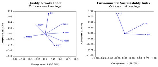 In principal component analysis, eigenvalues indicate how much general information is extracted from each principal component. Eigenvectors indicate how much weight each variable has in each component. A positive principal component loading indicates a positive relationship, whereas a negative loading signifies a negative relationship. In addition, the square of the factor loadings shows how much of the variance a variable explains in a factor. According to Table 4, the variables with the highest factor loadings in the first eigenvector for the quality growth index are MOR −52.97%, WO 47.87%, and RSC 44.68%. MOR explains 28.05%, WO 22.91%, and RSC 19.96% of the variance in the first eigenvector. The variables with the highest factor loadings in the second eigenvector of the quality growth index are EX 73.29%, PAT −41.18%, and SCH 33.86%. EX explains about 53.71% of the variance in the second eigenvector, PAT explains 16.95%, and SCH explains 11.86%. The variables with the highest factor loadings in the first eigenvector of the sustainable environment index are RE 71.77% and FA 64.12%. RE explains 51.50% of the variance in the first eigenvector and FA explains 41.11%. The variables with the highest factor loadings in the second eigenvector of the sustainable environment index are CO 89.74% and FA −43.80%. CO explains about 80.53% of the variance in the second eigenvector and FA explains 19.18%. The main directions between the variables are shown in the orthonormal loadings graph in Figure 1.