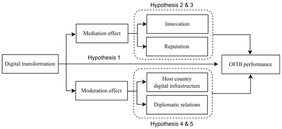 Although the potential benefits of digital transformation have been widely recognized, whether digital transformation affects the OFDI performance remains to be explored. As the largest emerging market country and the second largest country in terms of digital economy scale, China has ranked among the world’s top three countries in terms of OFDI flows for eleven years since 2012. The profitability of Chinese multinationals’ OFDI has been much lower than that of companies in major OFDI countries. The resource-based view suggests that a firm’s competitive advantage derives from its rare, valuable, imperfectly imitable, and irreplaceable resources [6]. The superior OFDI performance depends on the resources that they possess and the fit between these resources and the market [7]. As latecomers to the global market, emerging market enterprises (EMEs) encounter the liabilities of emergingness and country of origin in their pursuit of OFDI due to fewer firm-specific advantages (FSAs) than developed-market multinational enterprises (DMNEs) and home-country institutional hazards like state intervention [8]. These unfavorable factors incur credibility and legitimacy deficits in EMEs among the host country’s stakeholders, creating extra costs for conducting OFDI [9]. Digital transformation has triggered a radical revolution of technological paradigms, and the application of digital technologies to production processes is also complex, bringing both opportunities and challenges. Therefore, exploring whether and how digital transformation affects the OFDI performance in the context of China is of great significance for emerging market countries.