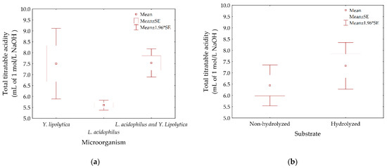 | Microorganism | Substrate | Total Titratable Acidity (mL of 1M NaOH) * |