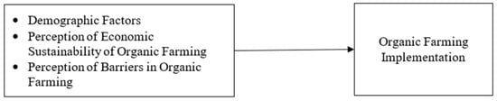 22]. Specifically, the quantitative analysis examined the relationships between farmers′ demographic characteristics, their perceptions of economic sustainability and barriers, and the implementation of organic farming practices. The effects of demographic factors, such as age, education level, gender, farming experience, and land ownership, were also analyzed. The research model is visually presented in