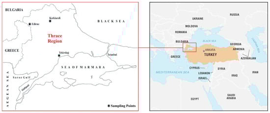 The population of this research consisted of farmers in the Thrace region in northwestern Turkey. The region comprises three provinces—Tekirdağ, Edirne, and Kırklareli—and is one of Turkey′s most important agricultural areas due to its fertile soil and favorable climate conditions. The sampling points across the region are shown in