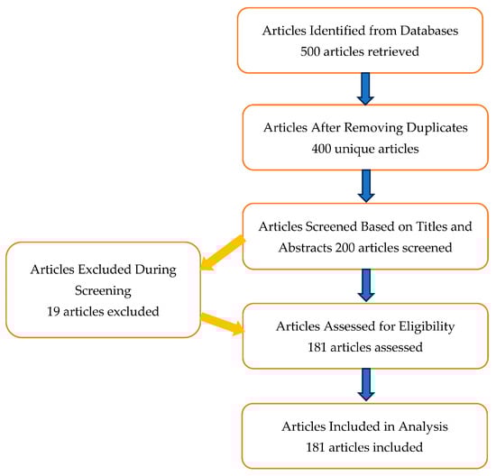 To provide a clearer understanding of the article selection process, the PRISMA flow diagram (Figure 1) below illustrates the stages of identification, screening, eligibility, and inclusion. This diagram highlights the number of articles processed at each stage and the rationale for exclusion.