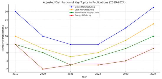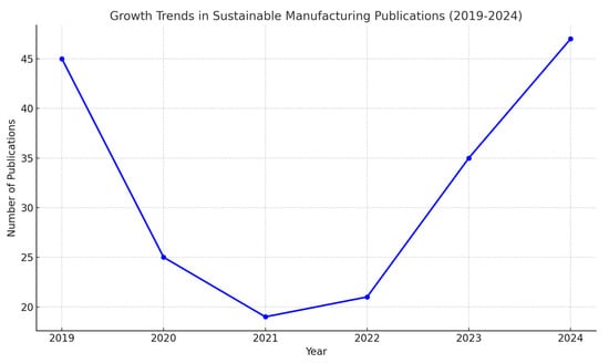 An analysis of 181 studies from 2019 to 2024 reveals dynamic trends in sustainable manufacturing research. Findings show an initial peak, pandemic-induced decline, and recent recovery with increased specialization. Key areas include green and lean manufacturing, sustainable supply chains, and energy efficiency, with growing focus on Industry 4.0 and circular economy principles. This evolution reflects the sector’s adaptation to global challenges, technological advancements, and demand for environmentally responsible practices [30,31]. Recent literature reviews emphasize the need for a holistic approach to sustainable manufacturing that considers environmental, social, and economic factors, aligning with the United Nations Sustainable Development Goals [31]. The field’s development highlights sustainable manufacturing’s crucial role in addressing environmental concerns while driving industrial innovation.