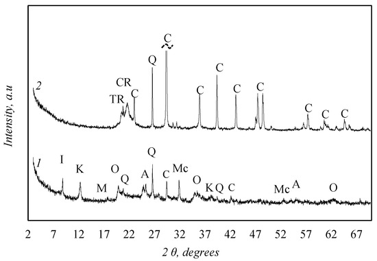 X-ray diffraction curves of EPW (1) and opoka (2). Indexes: M, muscovite KAl2(AlSi3O10)(F,OH)2; Q, quartz (SiO2); An, anorthite (Ca(Al2Si2O8)); C, calcite (CaCO3); K, kaolinite (Al2Si2O5(OH)4); I, illite (K0.65Al2.0[Al0.65Si3.35O10](OH)2); Mc, magnesite (MgCO3); O, olivine (MgFeSiO4); A, anatase (TiO2); Mg, magnesium oxide (MgO).