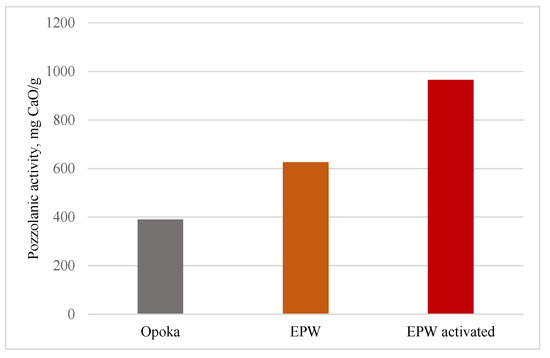 The pozzolanic activity of all materials (EPW, activated EPW, and opoka) was determined (Figure 4). The pozzolanic activity of EPW (626 mg CaO/g) corresponds to the average value of the pozzolanic activity and is almost twice that of opoka (390 mg CaO/g). After thermal activation of the tested dust, their activity increased by more than a third and reached a value of 965 mg CaO/g. This value corresponds to a high value of pozzolanic activity, as it is similar to the activity value of metakaolinite [24].