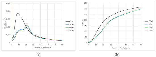 The influence of additives on the early hydration process of Portland cement was estimated by calorimetric analysis. During this study, heat flow (W/g) and heat of hydrating (J/g) of cement paste were measured. The results obtained are presented in Figure 5.