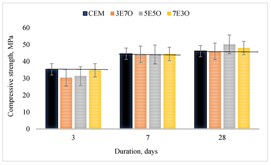 After 3 days of hydration, the samples without additives had the highest compressive strength (35.4 MPa). These data confirm that all additives delay the calcium silicate hydration. On the other hand, among the additive samples, the highest compressive strength (34.8 MPa) was determined for sample 7E3O, which contains the highest amount of activated EPW, which most significantly intensifies the hydration reactions of the aluminates. As the hardening time increases to 7 days, the compressive strength of all samples becomes equal and reaches 44.2–44.6 MPa. After 28 days of hardening, the compressive strength of the samples containing additives was the same (3E7O—46.0 MPa) or became higher (5E5O—50.2 and 7E3O—48.0 MPa) than that of the blank Portland cement sample (46.2 MPa). Therefore, with a shorter hardening duration (up to 7 days), the samples with a higher amount of the EPW component showed a higher compressive strength, but when the hardening duration was extended to 28 days, samples with the same amount of both additives showed the highest compressive strength (Figure 6).