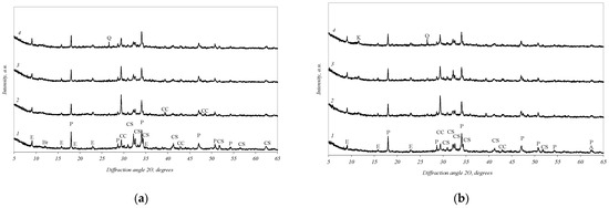 XRD analysis results of samples after (a) 3 and (b) 28 days of hydration. 1—CEM, 2—3E7O, 3—5E5O, 4—7E3O. Indexes: E, ettringite (Ca6(Al(OH)6)2(SO4)3∙26H2O); P, portlandite (Ca(OH)2); CC, calcite (CaCO3); CS, calcium silicates (C3S, C2S); Br, brownmillerite (C4AF); Q, quartz; K, monocarboaluminate (Ca4Al2(CO3)(OH)12·5H2O).