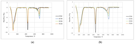 DSC analysis curves of samples after (a) 3 and (b) 28 days of hardening.