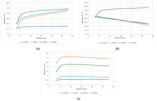 Thermogravimetric analysis data are presented in Figure 9, curves a–c. After 3 days of hydration, the maximum mass loss at 90–220 °C is recorded in the 7E3O sample, slightly lower in the 5E5O, and the lowest in the 3E7O and pure cement samples. During the decomposition of portlandite (~450 °C), the mass loss of all samples is quite similar. Meanwhile, during calcite decomposition, maximum mass losses were recorded in sample 3E7O, which contains the highest amount of opoka.