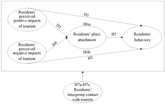 Second, scholars have suggested that residents’ behaviors are closely related to their place attachment and have attempted to provide management guidance for fostering supportive behaviors in residents based on the concept of place attachment [83,84,85]. Specifically, behaviors include word-of-mouth behavior [75,86], supportive behavior [87,88], and environmentally responsible behavior [89]. Therefore, Hypothesis 5 was proposed, as follows: