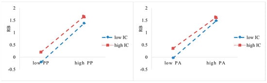 Simple slope analysis was employed to depict the alterations in the associations, namely, those between residents’ perceptions of favorable impacts from tourism and their behaviors and between place attachment and residents’ behaviors (Figure 2). For a low level of intergroup contact, residents’ positive perceptions had a significant positive effect on their behaviors (simple slope = 0.368, p < 0.001). For a high level of intergroup contact, residents’ positive perceptions of tourism impacts still influenced their behaviors (simple slope = 0.603, p < 0.001). H7a was supported.