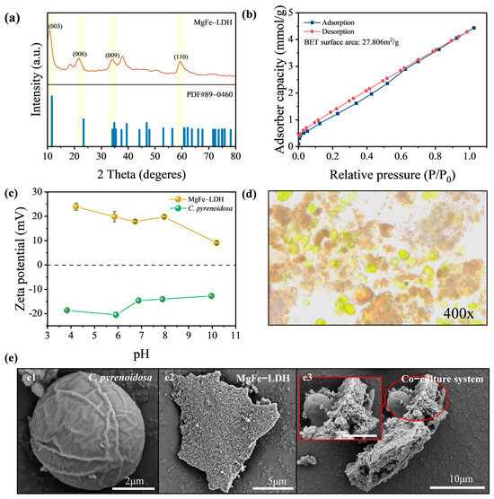 Self-assembly of MgFe-LDH and C. pyrenoidosa. (a) XRD pattern of MgFe-LDH; (b) CO2 adsorption capacity of MgFe-LDH; (c) zeta potential of MgFe-LDH and C. pyrenoidosa; (d) microscopic image of MgFe-LDH/C. pyrenoidosa co-culture system at 400×; (e) SEM images of C. pyrenoidosa, MgFe-LDH and MgFe-LDH/C. pyrenoidosa co-culture system.