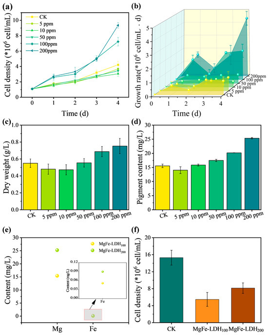 The effect of MgFe-LDH on C. pyrenoidosa growth. (a) Growth curve of C. pyrenoidosa; (b) growth rate curve of C. pyrenoidosa; (c) biomass accumulation of C. pyrenoidosa under different treatments on day 4; (d) pigment content of C. pyrenoidosa under different treatments on day 4; (e) concentrations of Mg and Fe elements in the leachate; (f) cell density of C. pyrenoidosa after 4 days of cultivation in the leachate.