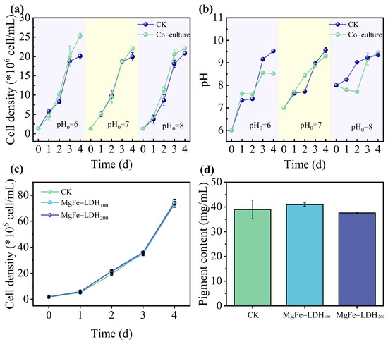 CO2 is typically supplied to microalgal culture media in the form of bubbles, forming four main inorganic carbon species (CO2, H2CO3, HCO3−, CO32−) [25]. The pH of the medium plays a critical role in determining the dominant carbon species [52,53,54], which may subsequently influence the ability of LDH materials to enhance microalgal CO2 fixation. Therefore, C. pyrenoidosa was cultivated under different initial pH conditions to evaluate whether MgFe-LDH promoted microalgal growth by increasing local CO2 concentration. For consistency and clearer comparison, an MgFe-LDH concentration of 200 ppm was used throughout these experiments. As shown in Figure 3a,b, the cell density and medium pH were monitored under various initial pH conditions. The results indicated that compared with the control, the cell density of C. pyrenoidosa in the co-culture group was significantly increased by 26.15%, 10.76%, and 6.23% for initial pH values of 6, 7, and 8, respectively. The stronger promoting effect observed at lower pH may be attributed to the higher solubility of CO2 under acidic conditions, which allowed MgFe-LDH to function more effectively as a CO2 concentrator. Additionally, an experiment with 2% CO2 injection was conducted to examine the effect of MgFe-LDH on C. pyrenoidosa growth under high CO2 concentration conditions. As shown in Figure S2, the pH values measured on day 1 and day 4 after the injection of 2% CO2 indicated that CO2 supplementation effectively stabilized the pH variation in the culture system. As illustrated in Figure 3c, the cell density in the control group reached 74.87 × 106 cells/mL, while the values for the 100 ppm and 200 ppm MgFe-LDH treatments were 72.89 × 106 cells/mL and 73.78 × 106 cells/mL, respectively. No significant differences were observed among the three groups, suggesting that the presence of abundant dissolved CO2 diminished the relative contribution of MgFe-LDH to carbon availability.