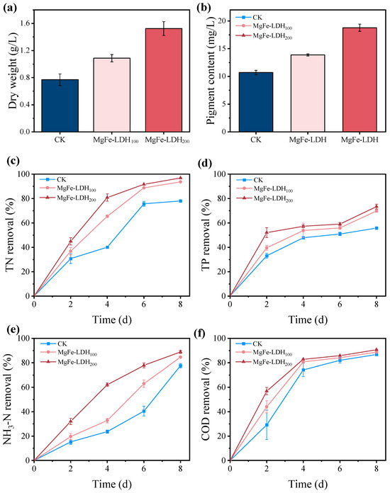 Effect of MgFe-LDH on nutrient removal by C. pyrenoidosa; (a) dry weight of C. pyrenoidosa; (b) pigment content of C. pyrenoidosa; (c) TN removal; (d) TP removal rate; (e) NH3-N removal; (f) COD removal.